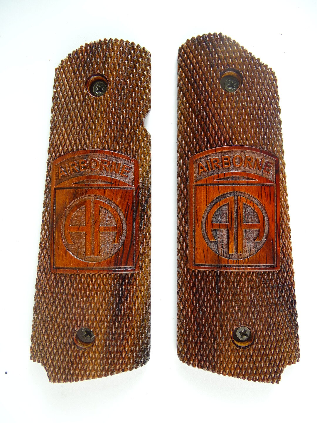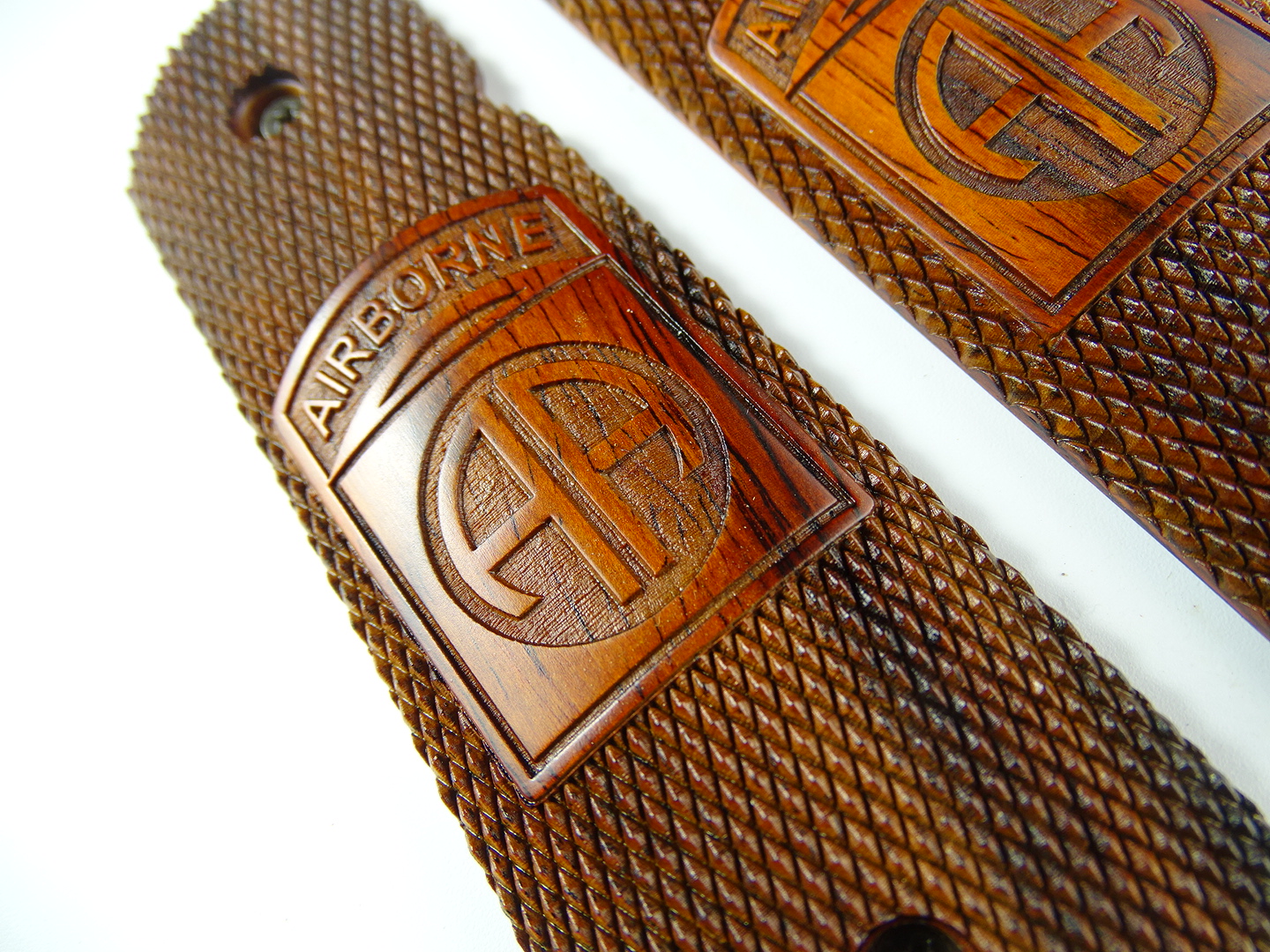 1911 cocobolo grips with the US 82nd Airborne emblem engraved. 5 point traditional checkering, standard thickness, Government size.